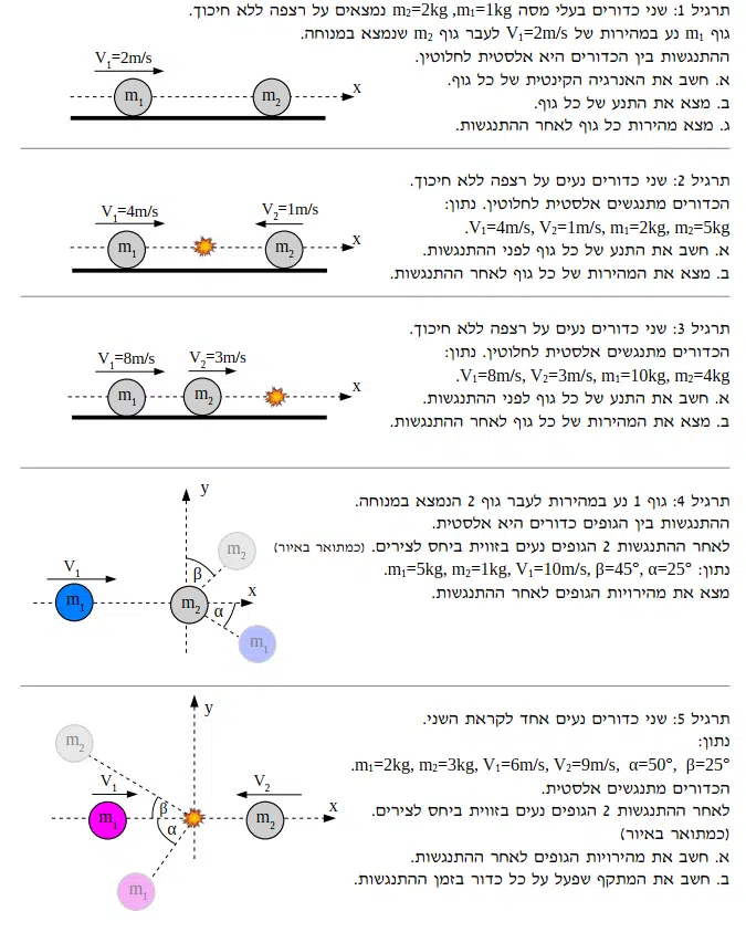 כאשר m1 ו-m2 הם המסות של הגופים, v1 ו-v2 הם המהירויות שלהם לפני ההתנגשות, ו-v1 ו-v2 הם המהירויות שלהם לאחר ההתנגשות.