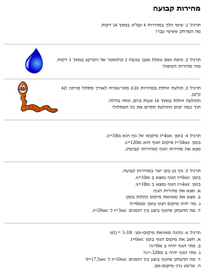 כאשר v הוא מהירות, d הוא מרחק, ו-t הוא זמן. באמצעות נוסחה זו, נוכל לחשב את המהירות של גוף שנע בקצב קבוע בקו ישר.